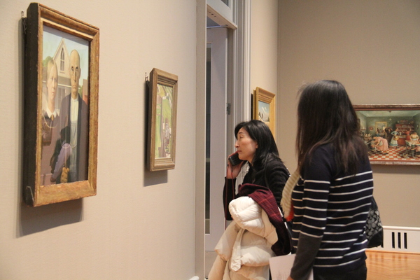 参观者在芝加哥艺术馆阵列的“格兰特•伍德的《美国哥特式》”前倾听中文解说。