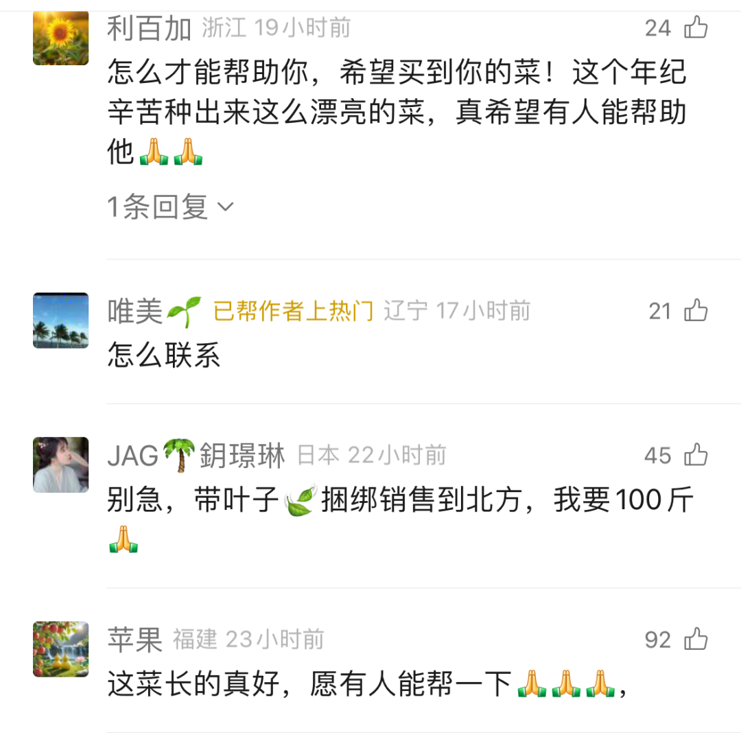 很快,一支由公益安排和村干部组成的志愿者部队敏捷集结,帮助采摘、分拣和打包蔬菜。当地供销集团也加入了这场爱心助农举动。一份份订单从五湖四海涌来,让或许烂在地里的蔬菜一会儿有了生路。